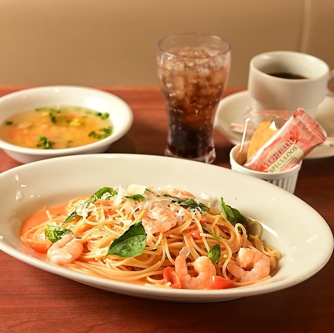 その日の気分に合わせてパスタorピザを選べるランチセット。スープやお口直し、ドリンクバー付きでお得です