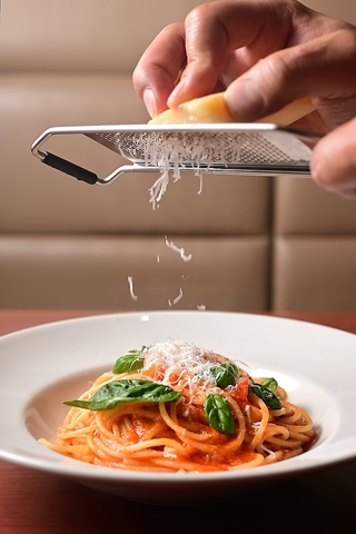 お昼は窓からの陽光が心地よい店内で、爽やかなパスタランチを。夜はほのかな灯りが空間を優しく包み込み、落ち着いた大人のバルへと様変わりします◎手作りの絶品パスタと、果実の甘みが溶け込む自家製サングリアの相性は抜群。一軒目でのしっかりとしたお食事から、大切な方と過ごす優雅な夜のひとときまでどんなシーンにも大活躍間違いなし♪