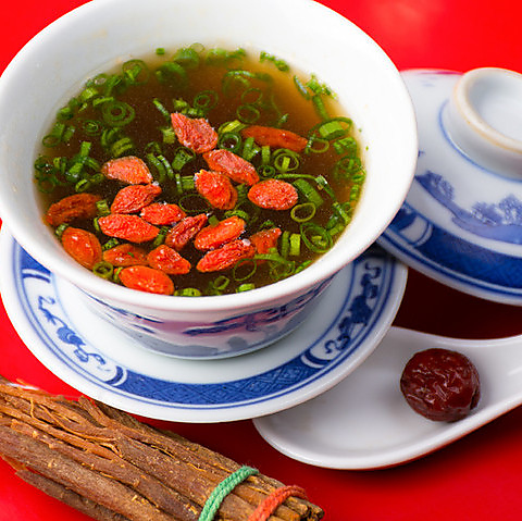 野菜や肉、魚介の旨みを丁寧に引き出した薬膳スープ。生姜・艾葉(ガイヨウ)・当帰(トウキ)を基調に、季節ごとに異なる25種の薬草と、アヒルや烏骨鶏、山芋、豚肉団子など12種の具材を贅沢に煮込んだ、繊細で深みのある味わいです。