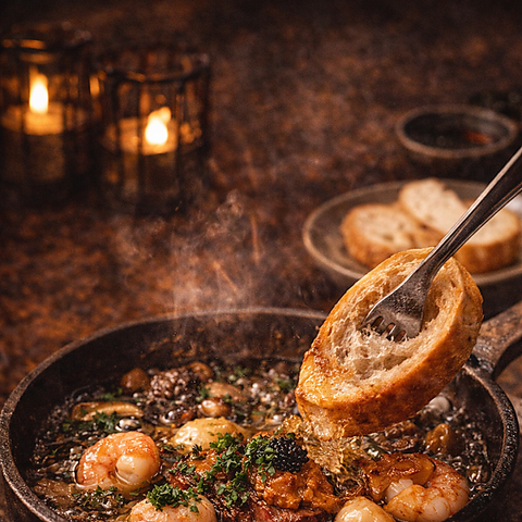 食べ応えのある海鮮をたっぷりと使い、ニンニクの香るオリーブオイルでじっくり煮込んだアヒージョです!できたての熱々をそのままご提供いたします。一皿1200円(税込)でお楽しみいただけるので、お酒のお供にも最適です。海鮮アヒージョをはじめ、全4種類のバリエーションをご用意しております◎
