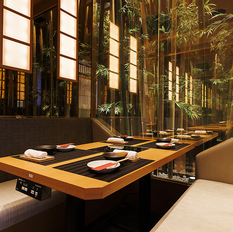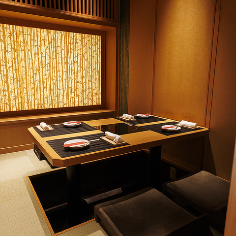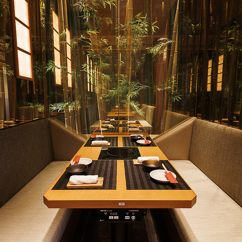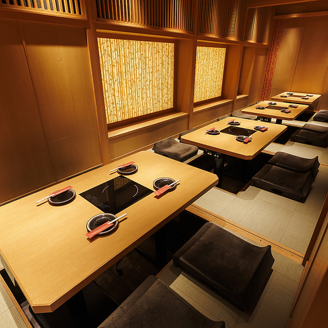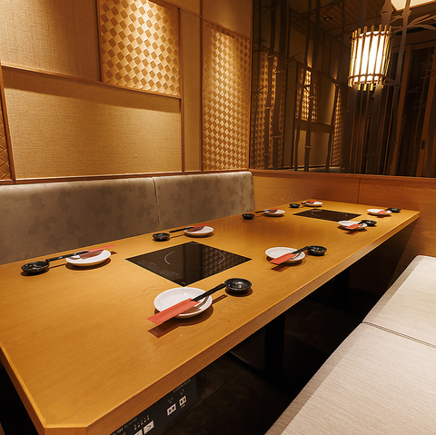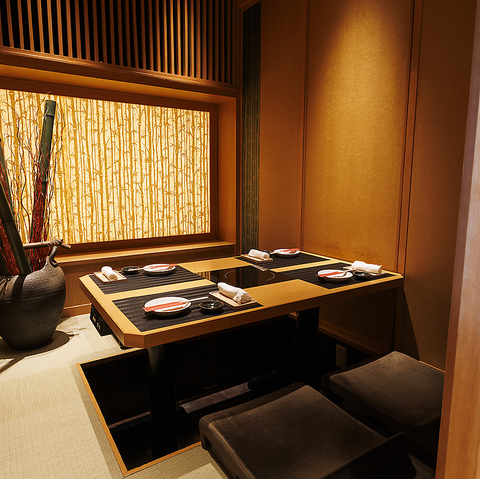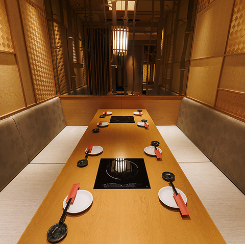 間接照明の効いた大人な雰囲気の広々としたゆったり個室は接待や会社同僚の宴会にぴったりです。暖かみのある照明が語らいと特別な空間を演出致します。少人数から大人数のお客様までプライベートな空間で楽しめます。