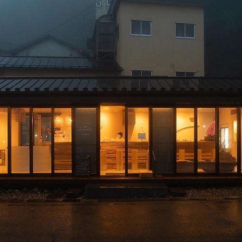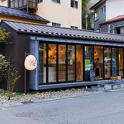 福島県産の杉材をふんだんに使用した店内は、足を踏み入れた瞬間に木の香りが広がる癒やしの空間です◎大きな窓からは荒川の清流や四季折々の山々を眺めることができ、開放感は抜群♪モダンながらも温かみのある内装は、温泉街の散策途中にふらりと立ち寄りたくなる心地よさです。