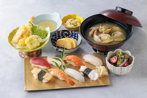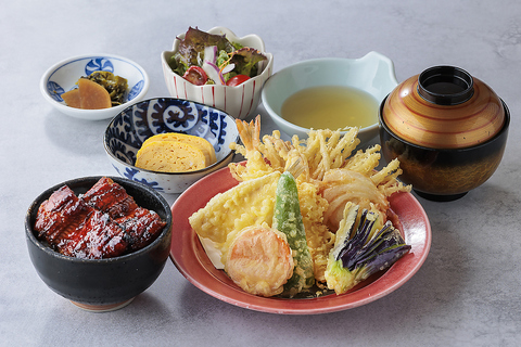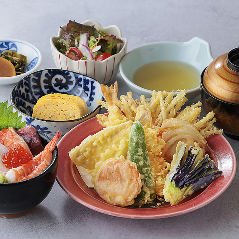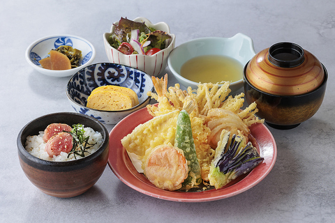 ボリュームも満足感も兼ね備えたご飯大盛無料が嬉しいランチ定食を種類豊富にご用意しています。サラダ・だし巻き・味噌汁・お新香付きの「炙りサーモンの月見飯とごちそう天ぷら定食:1980円(税込)」、サラダ・鯛の出汁・お新香付きの「鯛の月見茶漬けご飯と旬野菜天ぷら定食:1980円(税込)」など充実のラインナップです◎