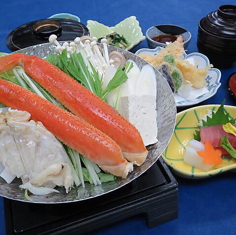 天ぷら、刺身、煮物、小鉢のセットです。 茶碗蒸し、ご飯、椀、香の物付。