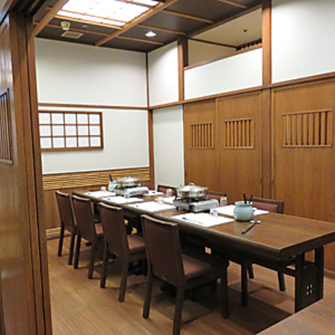 木目調で統一されたシックな雰囲気の洋間個室。最大10名様程度まで収容可能で、靴を脱がずにご利用いただける為、足腰に不安のある方やビジネスシーンでのご利用にも大変便利です。都会の喧騒を忘れるような静かなプライベート空間で、旬の味覚をふんだんに取り入れた会席料理やしゃぶしゃぶを心ゆくまでお愉しみください。