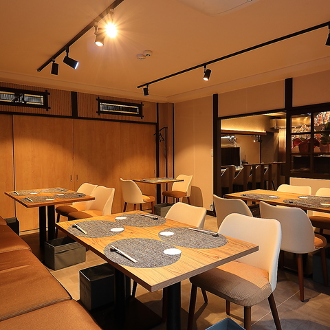 広々とした空間をご用意しています。落ち着いた照明と洗練されたインテリアが特徴で、ゆっくり食事を楽しみたい方にぴったり!会食やお祝いの席にも最適です。目の前で調理するスタイルは演出感も抜群!贅沢な時間を存分にお楽しみいただけます。