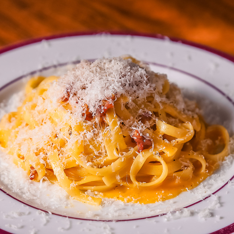 濃厚な卵とチーズだけで仕上げる大人のカルボナーラ。トリュフの香りと共にお楽しみください。