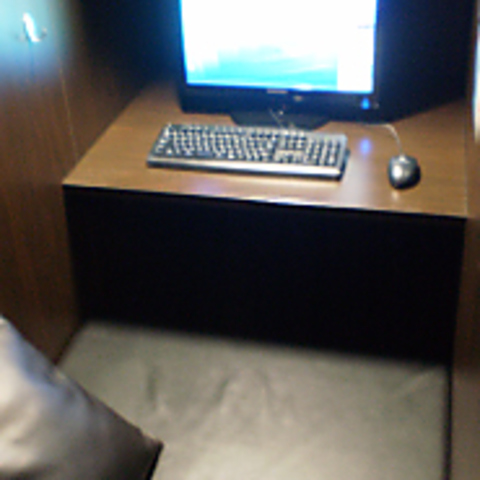【ソファーチェア席】パソコンとテレビが両方ご利用頂けるソファーチェアのお席です。足下にオットマンがあり、足を置いてくつろぐ事ができます。
