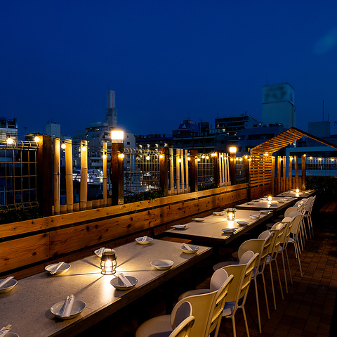 【総席数:100席】屋上の端に位置するお席からは、蒲田の街並みや夜景をより間近に楽しめます♪開放的な景観をバックに写真を撮れば、SNS映えもバッチリ◎都会の夜を感じながら、贅沢な乾杯の時間を過ごせる特等席です。