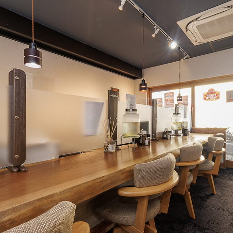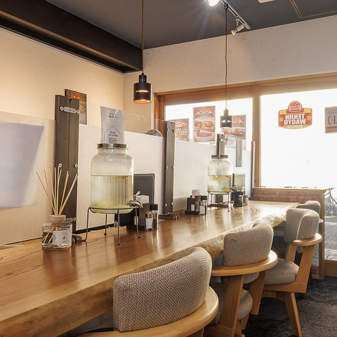お一人様も気軽に楽しめるカウンター席をご用意。木の温もりを感じるカウンターは、ランチやカップルでの利用にもぴったりです。落ち着いた雰囲気の中で至福のバーガータイムをお過ごしください。もちろん、店内はすべてハラール対応。国籍や宗教を問わず、安心してお食事を楽しんでいただけます。