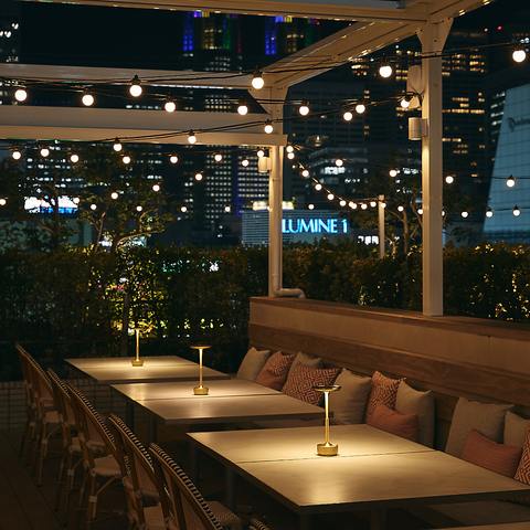 新宿のビル群を背景に広がるのは、白を基調とした地中海の街角を思わせる洗練されたテラス。日常の喧騒を忘れさせる心地よい風と、計算し尽くされたスタイリッシュなインテリアが、あなたを瞬時に海外リゾートへと誘います。光と影が織りなす開放的な空間で、都会にいることを忘れる極上のリラックスタイムをお過ごしください。