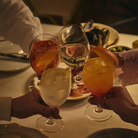 アサヒスーパードライや芳醇な黒生、イタリア産「ペローニ」が揃う贅沢なラインナップ。さらに白・赤・ロゼに加え、トレンドのオレンジワインまで計8種をご用意しました。お好みのリキュールを自由に割って作るオリジナルカクテルや、多彩なソフトドリンクも充実。都会の夜風を感じながら、心ゆくまで乾杯を。