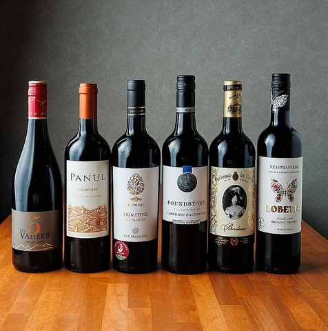 【豊富なワイン】ソムリエ厳選の豊富なワインラインナップ。 弾ける泡から、芳醇な赤、清涼感あふれる白まで。一口含めば、ブドウの力強い香りが花開きます。当店自慢の一品料理との、至高のマリアージュをぜひ。