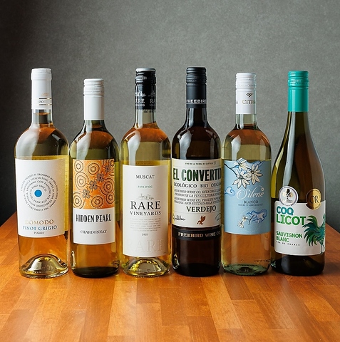 飲み放題はワインも赤・白・スパークリングワイン4種ずつご用意しています。美味しいお料理と相性の良いワインをリーズナブルにご提供しています。昼飲みでもお楽しみいただけるように昼飲みようの飲み放題付きコースもございます。