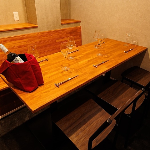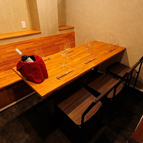 お席は個室5~7名様、テーブル3~15名様、カウンター2名様×2あり、さまざまシーンで利用可能です。個室でのプライベート空間でゆったりと楽しむも良し、テーブルやカウンターでご友人や同僚、パートナーの方とお楽しみいただくのも良しです。落ち着いた雰囲気のお店なので、ゆったりとお楽しみください。
