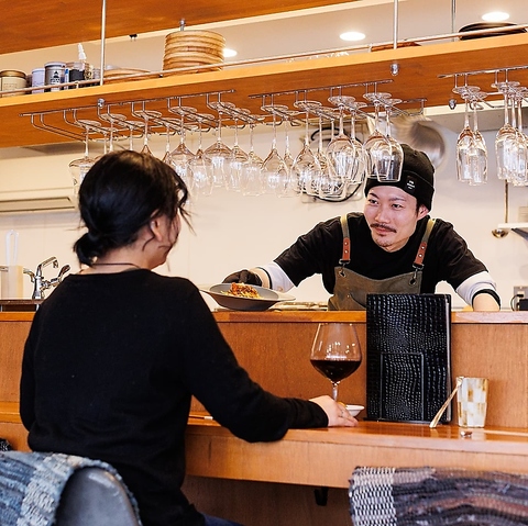 【カウンター2名様×2】カップルやパートナーとのデート、女子会・夜ご飯におすすめです。ライブクッキング感を楽しみながら、料理とワインの最高のペアリングをご提供いたします。