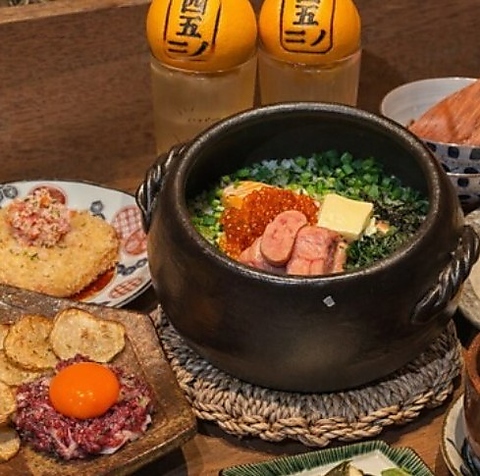 京都の老舗「八代目儀兵衛」の厳選米を、じっくり時間をかけて炊き上げた名物「土鍋御飯」は必食の逸品です。和から洋まで様々なテイストを盛り込んだ、当店ならではの創作料理ラインナップも自慢のひとつ。新しい驚きに出会える独創的なメニューの数々が、お食事の時間をさらに豊かに彩ります。