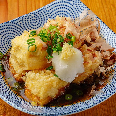 揚げたての豆腐に、香り豊かなだしをたっぷり絡めた心温まる一品。外側のサクッとした衣と、中のふわりとした食感のコントラストが楽しめます。おろしやネギ、かつお節を合わせることで風味がさらに広がり、食べ疲れしない優しい味わいに。食事の合間にも締めにもぴったりで、ついまた食べたくなる人気の一皿です。