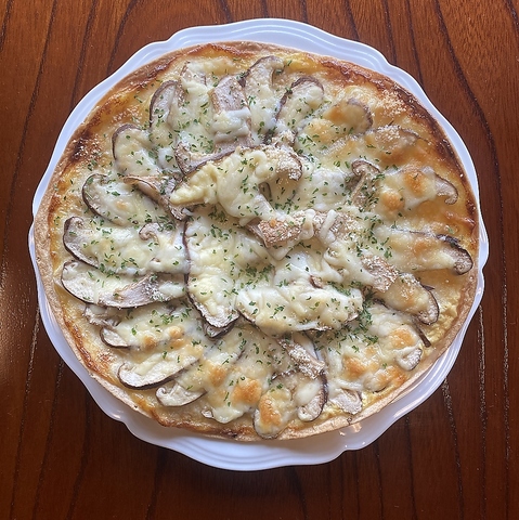 自家製の新鮮なしいたけを贅沢に使用した和風ピザ☆その日に収穫した分を使用するので旨みが凝縮されています♪椎茸好きにはたまらない、一口ごとに広がる風味と食感をお楽しみください◎