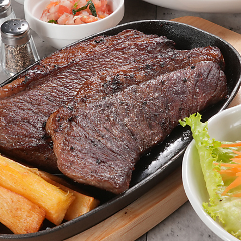 ブラジルの大人気メニュー!シュラスコ!お尻部分の柔らかなイチボを使用し、鉄板でアツアツに焼き上げることで外は香ばしく中はジューシー☆牛肉本来の旨味を味わえます。肉汁をしっかり閉じ込めるため、焼き加減にもこだわり◎肉汁たっぷりの旨味と独特の歯ごたえを存分にお楽しみください。