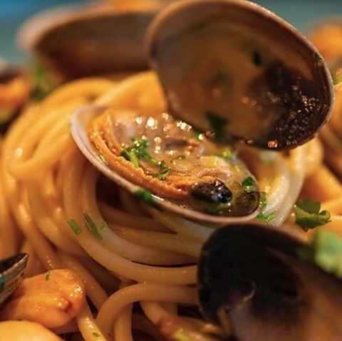 アサリのダシが染み出した塩味の効いたソース。もちもち太麺スパゲットーニで。提供までに15分ほどお時間をいただきます