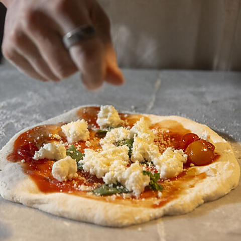 目指すのは「飲めるピザ」。自家製酵母の生地を96時間低温発酵させ、超多加水に仕上げることで、ふわもちの軽い口溶けを実現しました。こだわりの「りんごの薪」で焼き上げるピッツァは、香りも格別です。近隣牧場のミルクで作る自家製チーズや自慢の生ハムが彩る、老若男女に愛される一枚をぜひご堪能くださいませ。