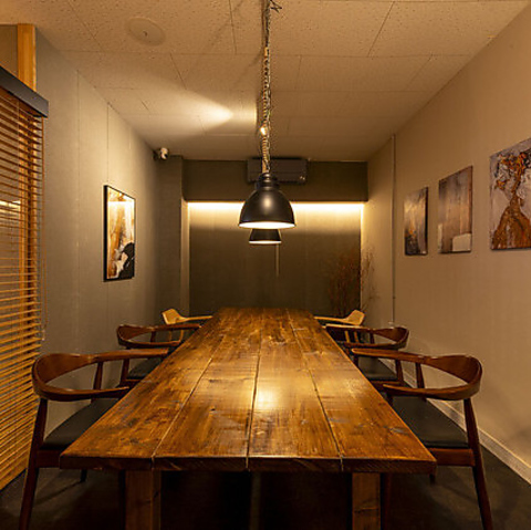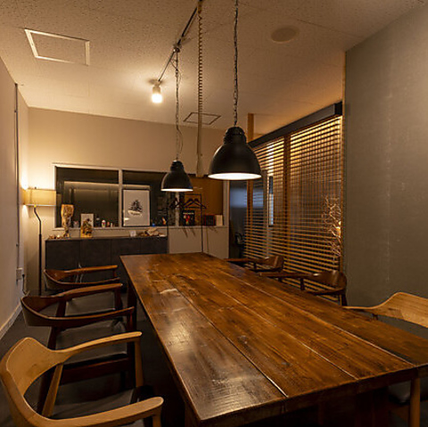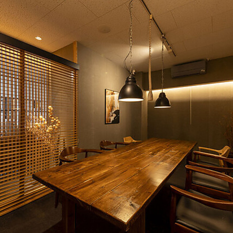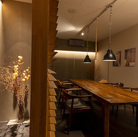 約8名様までご利用いただける個室は、ご家族の記念日や大切な会食、お子様連れのお食事にぴったり。ウッドブラインド越しに差し込む柔らかな光と、プライバシーが確保された空間で、会話も弾みます。落ち着いた雰囲気の中で、自慢の料理とドリンクをゆっくりとご堪能ください。