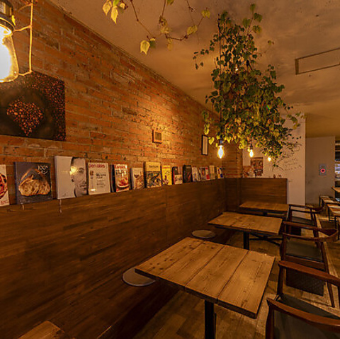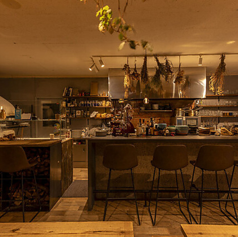 グレーのレンガと木目の温もりが調和する店内は、間接照明が優しく灯る大人の隠れ家。アメリカの古い足場板を用いた大テーブルやモールテックスのカウンターなど、素材の質感にまでこだわった洒落た雰囲気です。洗練されていながらも肩肘張らずに過ごせる心地よさが、特別なひと時を演出します。
