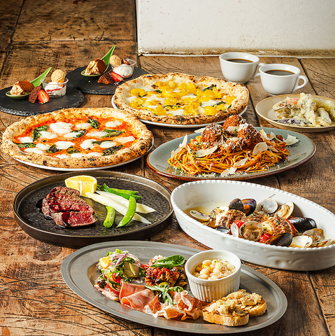グランドメニューよりお好きなPIZZAをお選びいただき、その価格に税込¥2,200を追加することでお楽しみいただけるランチ限定コース。ランチ前菜盛り合わせに加え、メインディッシュ、本日のデザート、選べるランチドリンクをご用意。お好みのPIZZAとともに、ゆったりとしたランチタイムをお楽しみいただけます。