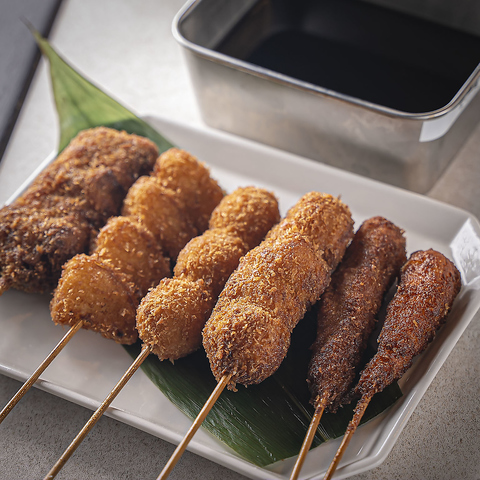 厳選した素材をキメの細かい衣で包み、カラッと揚げた「串カツ」は、何本でも食べられる軽やかな食感が自慢です!自家製の特製ソースをたっぷりつけてお召し上がりください。おでんや焼き鳥の合間のアクセントにも最適です。キンキンに冷えたビールやハイボールと一緒にぜひ!
