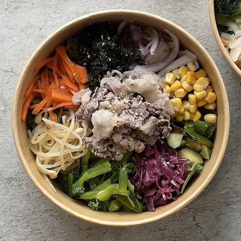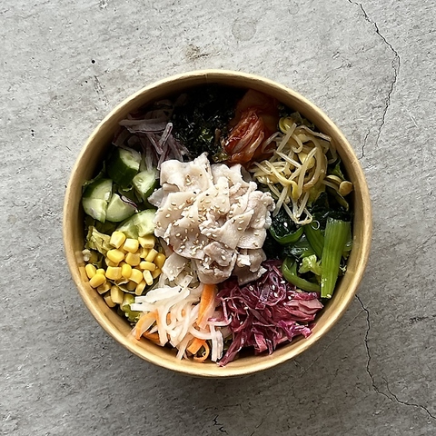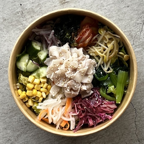 「内容」玄米100g/ケール/サニーレタス/豚ロース/豆もやしのナムル/小松菜ナムル/紫キャベツナムル/大根とにんじんの酢ナムル/キムチ/きゅうり/コーン/レッドオニオン/韓国海苔