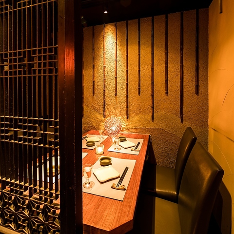 落ち着いた和の雰囲気が広がる店内は、ゆっくりと食事を楽しみたいデートにもおすすめの空間。柔らかな照明に包まれた席で、周囲を気にせず二人だけの時間をお過ごしいただけます。ゆったりとした空間の中で、会話と食事を楽しむひとときは特別な夜にぴったり。
