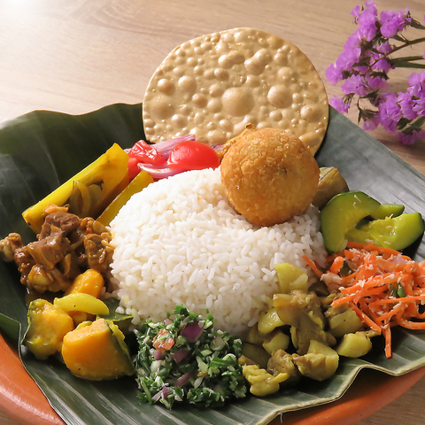 当店でぜひ召し上がっていただきたいのが、ライスに7種類のカレーを添えた「スリランカスタイルカリー」です。ベジタブル、フィッシュ、チキンなど、お好みのメインをお選びいただけます。それぞれのカレーを少しずつ混ぜ合わせることで、スパイスの奥深い香りと重層的な旨みが口いっぱいに広がります♪