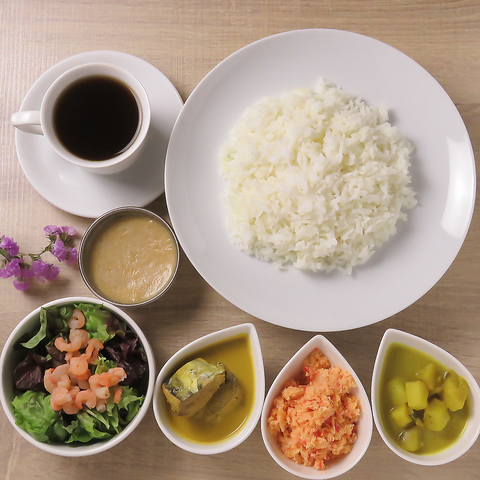 ライスに7種類のカレーを添えた、彩り豊かで本格的な一皿です◎お好みの具材を選べるのが魅力で、ベジタブルカレーなら1100円(税込)、フィッシュカレーは1150円(税込)、チキンカレーは1200円(税込)でご提供。その日の気分で選べます!異なるカレーを混ぜ合わせることで変化する奥深い味わいをぜひお楽しみください♪