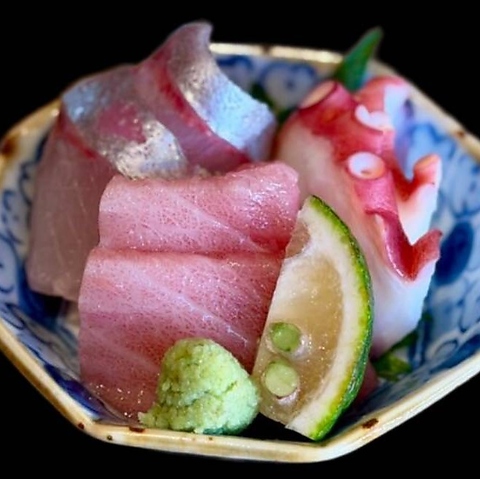 おすすめの鮮魚を豆皿で気軽に楽しめる刺し盛り。お酒と相性抜群の定番おつまみで、仕事帰りの一杯や、まず頼みたい一品にぴったり。少しずつ色々味わいたい方にもおすすめ、気軽につまめる人気の逸品です♪