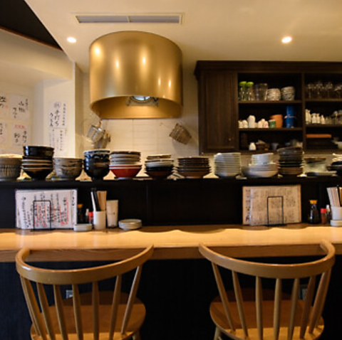 【1階カウンター席】お一人様やデートに最適◎木の質感に癒やされるカウンター席は、全部で8席。職人の調理風景を目の前で楽しめる特等席です♪お仕事帰りの一杯や、静かに食事を楽しみたい夜にぴったり。うどん1杯でも気軽に入りやすい、温かな雰囲気が魅力です◎