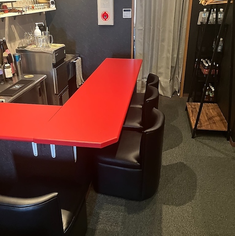 鮮やかな赤が目を引くカウンター席を5席完備しています。シックな黒の壁面とモダンなコントラストを描く空間は、お仕事帰りの一杯や大人のデートに最適。スタッフとの会話を楽しみながら、ゆったりとお酒を嗜むのにぴったりのお席です。