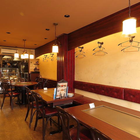優しい照明と木の温もりが心地よい店内。全席鉄板付きのテーブルで、名物のお好み焼きをご堪能ください