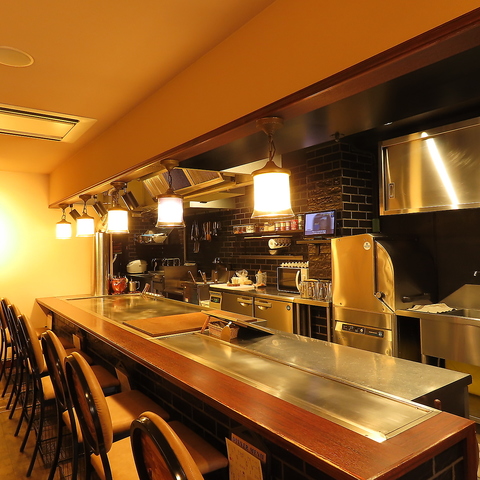 イケメンオーナーが目の前で焼き上げる鉄板料理。焼き音と香ばしい匂いが食欲をそそるカウンター席。