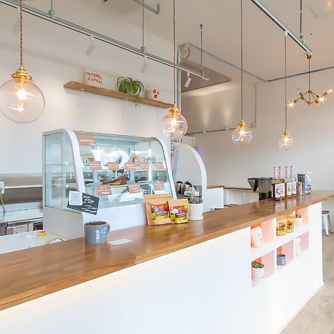 白を基調とした清潔感あふれる店内には、柔らかな光を放つペンダントライトと木の質感が心地よい注文カウンターをご用意。こだわりのウガンダコーヒーを淹れる香りに包まれながら、ゆったりとした時間をお過ごしいただけます。お仕事帰りや、ちょっとした休憩にも。どなたでもお気軽に立ち寄れる温かな空間です。