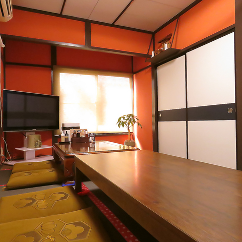 鮮やかな朱色の壁が印象的なお座敷は、和の趣あふれる贅沢なプライベート空間。広々とした畳敷きにテレビも完備し、まるで自宅のように寛いでお過ごしいただけます。ご家族での団らんや、お仲間とのご宴会、大切なおもてなしにも最適です。揚げたてのとんかつを囲みながら、水入らずのひとときをお楽しみください。
