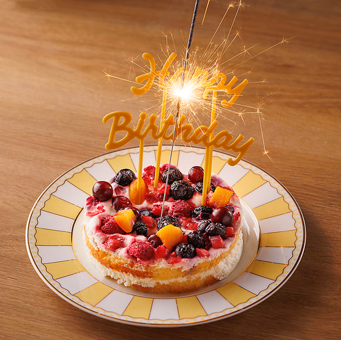 お誕生日や結婚祝い、歓送迎会など、様々なお祝いに♪花火付きホールケーキを2,200円(税込)でご用意できます★※ケーキサイズは4号(12cm)です。詳細はお電話にてお問合せください。