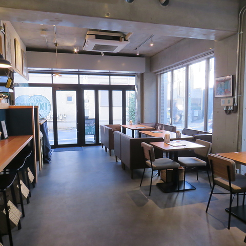 【親しみやすく広々とした店内空間】店内は明るく開放的で、初めてでも入りやすい親しみやすさが魅力。テーブル席とカウンター席がバランスよく配置され、ひとりでもグループでも利用しやすい造り。落ち着いた雰囲気の中で、ゆっくり食事を楽しめる空間です。