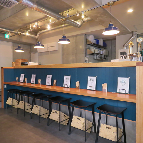 【ひとり時間を楽しめるカウンター席】カウンター席は1名でもゆったり座れるように設計されており、仕事帰りやランチにふらっと立ち寄りやすい雰囲気。スタッフとの距離も近く、温かい接客に癒されながら、気兼ねなく食事を楽しめる居心地の良いスペースです。