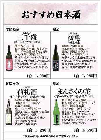 季節に合わせた日本酒や、じんわり染みる熱燗を厳選!豊富なラインナップで、お好みの一杯をお楽しみ下さい