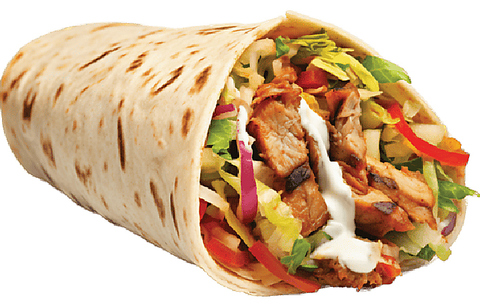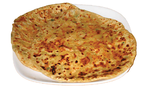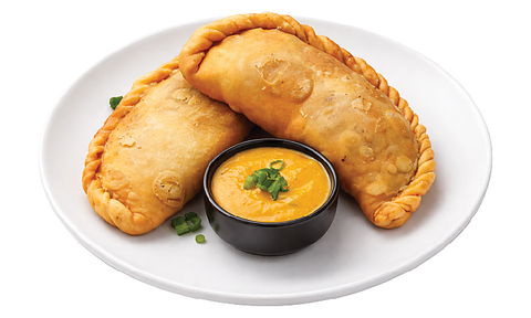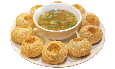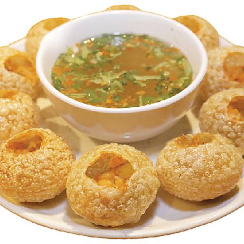 薄焼きの球状クラッカーにじゃがいもや豆などの具材を詰め、スープソースに浸して食べる軽食