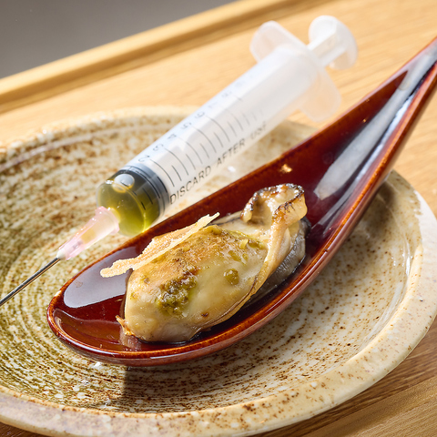 岡山県邑久町産の大ぶり牡蠣をワンスプーンで贅沢に味わえる華やかな一品です★自家製合わせ醤油にほんのりバジルソースを重ね、店員さんが注射器で注ぐトリュフオイルの香りがぱっと広がる楽しさ♪ぷりぷり弾力と濃厚クリーミーな旨みが押し寄せるブランド牡蠣です★知る人ぞ知る味わいで、余韻までしっかり楽しめます!