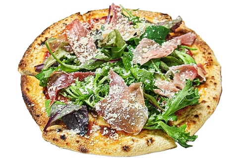 おつまみにぴったりな、薄めの生地に生ハムをのせたシンプルなピザです。プロシュートの程よい塩気とチーズのコクが、ワインやカクテルの味を引き立てます。重すぎないので、会話を楽しみながら何人かでつまむのにもちょうど良いボリューム感です。