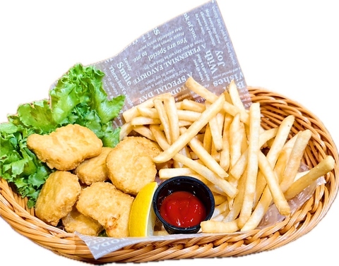 とりあえず頼んでおけば間違いない、ポテトとナゲットのコンビです。カリッと揚げたポテトの塩気と、パクパク食べられるナゲットは、どんなお酒のお供にも最適。おしゃべりの邪魔をしないサイズ感で、最後までテーブルにあると嬉しい、安心のサイドメニューです。