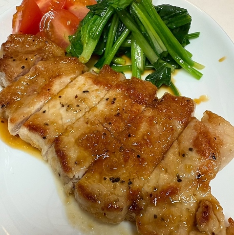 甘辛ダレに漬け込んだ豚肉をジューシーに焼き上げました。生姜の香りが食欲をそそります♪